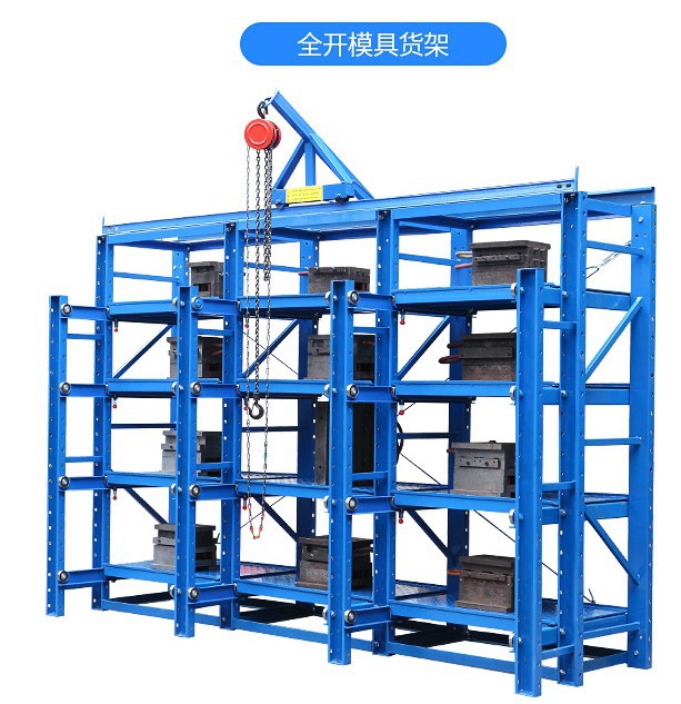 组合抽屉式结构,适用于存放模具,安全可靠可容易地抽出300-1200kg/层的货物,顶部选票配天轨,手拉葫芦、小车、便于模具的起吊和存放。