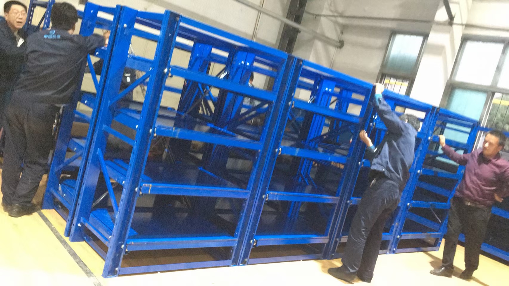 2、模具货架抽屉盘主要由滑轨、抽屉盘组成。抽屉盘由矩管加折弯件焊接而成的框架和钢板组成。每条滑轨由两个轴承前后上下固定,可以在导向槽内随意滚动,阻力小,可以轻松拉出抽屉。