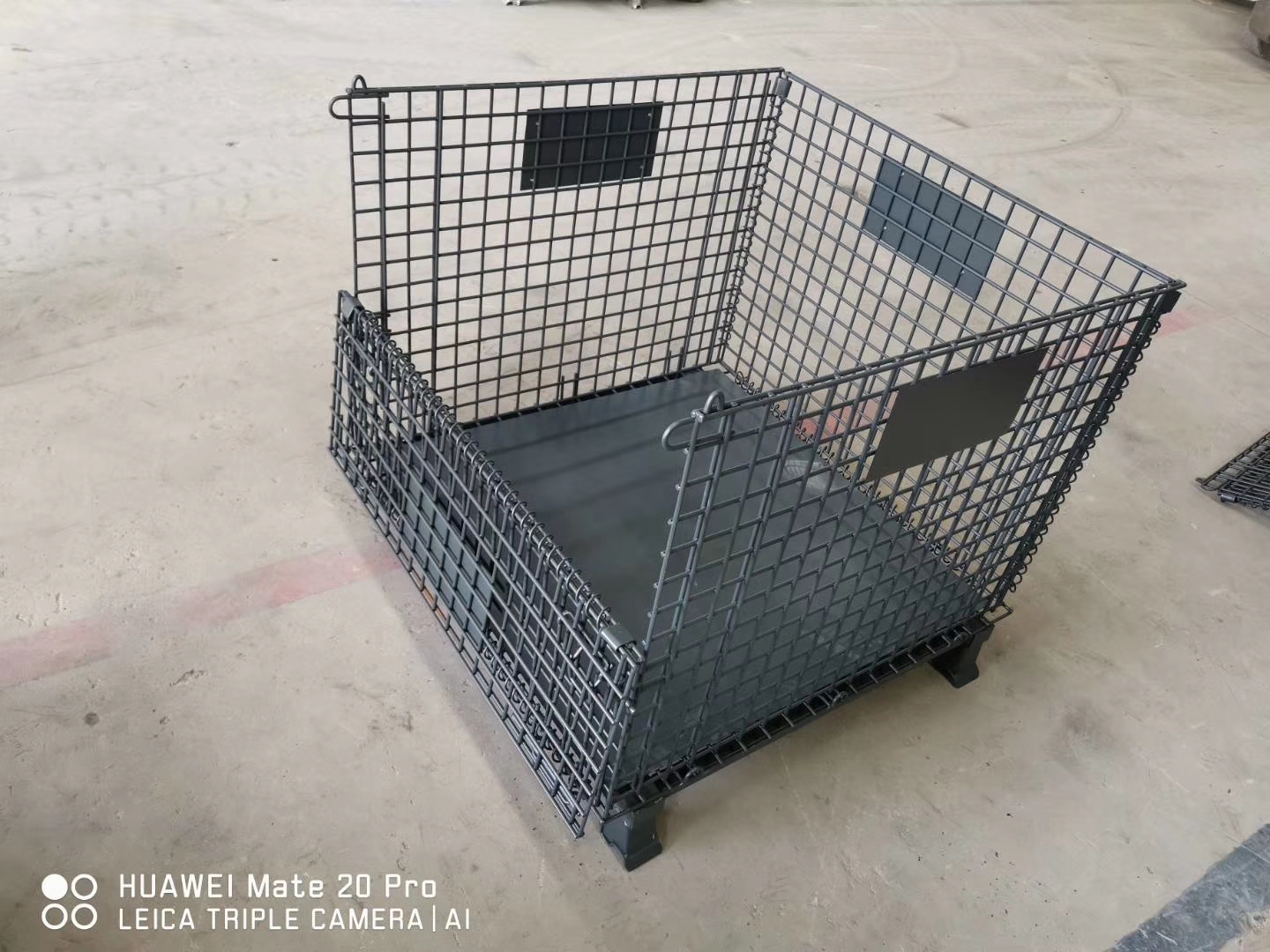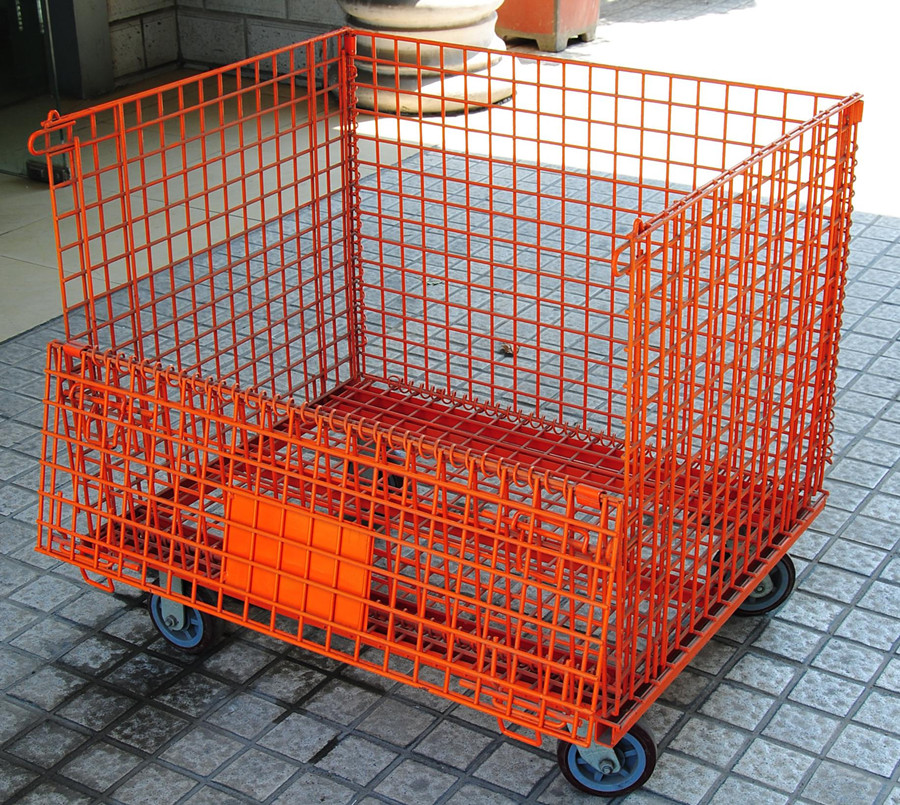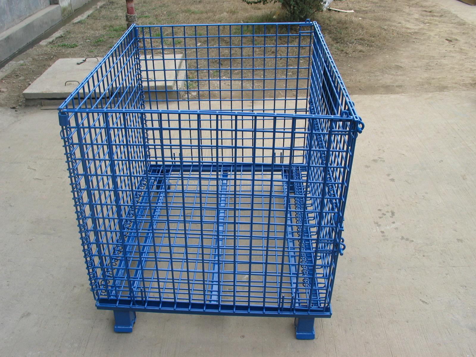 主要原材料是高线拉成的强力钢丝,一般丝径是4.8mm, 5mm, 6mm, 6.4mm。网片焊接的网目间距一般为50×100,100×100,50×50,50x25,25x25,仓储笼底部采用U型槽钢焊接而成,U型槽钢是冷轧带钢轧机轧制而成,底部四脚采用冲压件冲压成型,一般成型片为2片冲压件,然后2片冲压件焊接而成。仓储笼的脚高一般为100,也有120mm高度的。