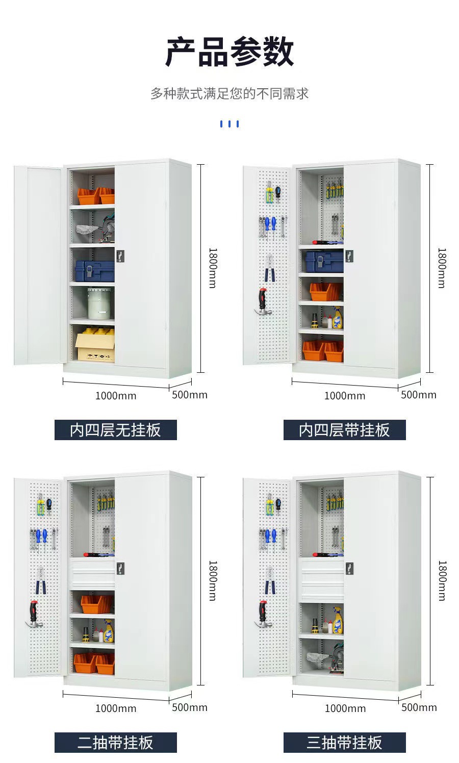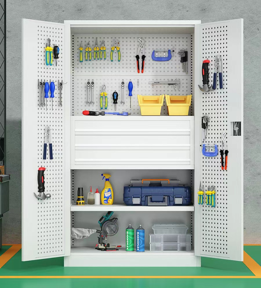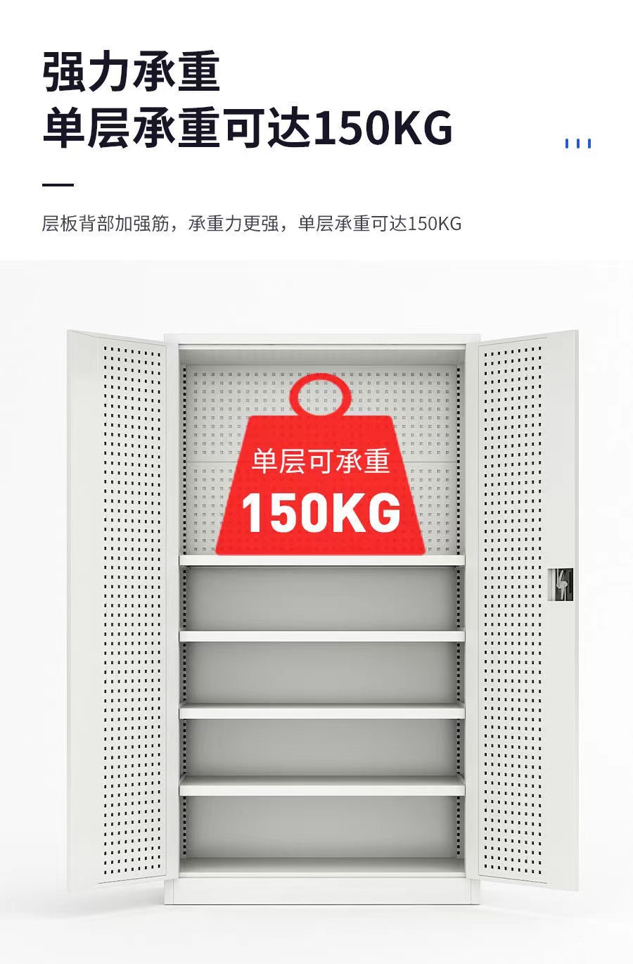 4、标配柜体内每层层板载重100KG。每个抽屉载重80KG。柜体门内板上带有方孔和百叶挂板、可挂各类物件及工具。