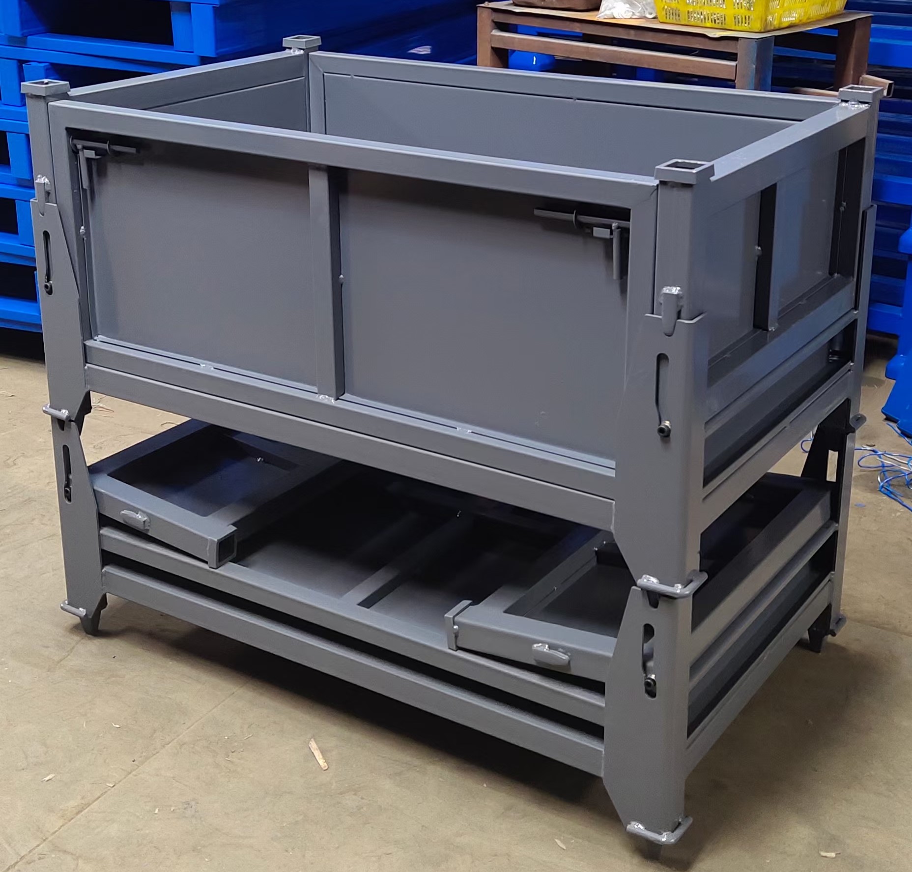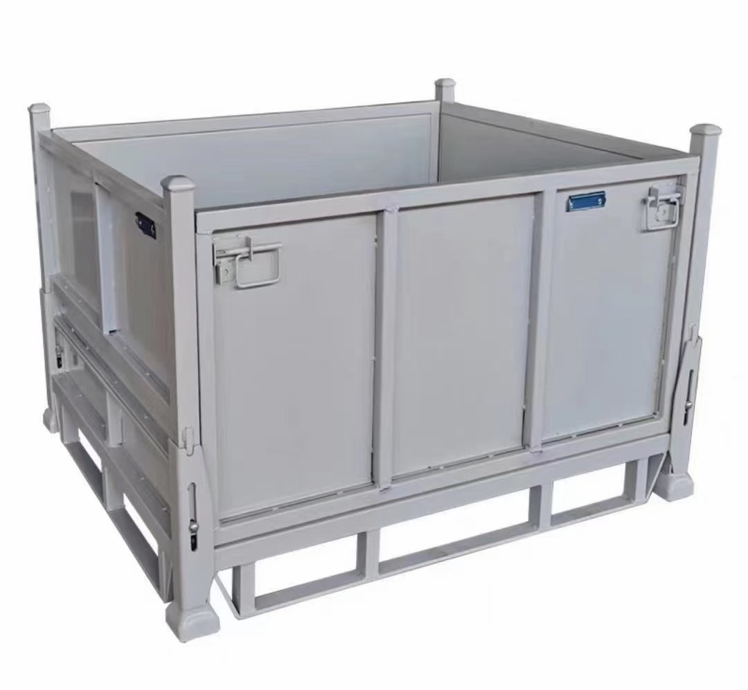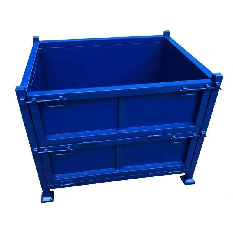 钢制料箱钢制料箱底部采用框架式刚性结构,由钢质面板与钢质支腿焊接而成。结构形式多样,使用便捷灵活,承载能力强。料箱通常可互相堆垛,也可配合叉车在区域能流动,亦可在底部安装脚轮,还可以配合航吊使其起升、移位、下落。